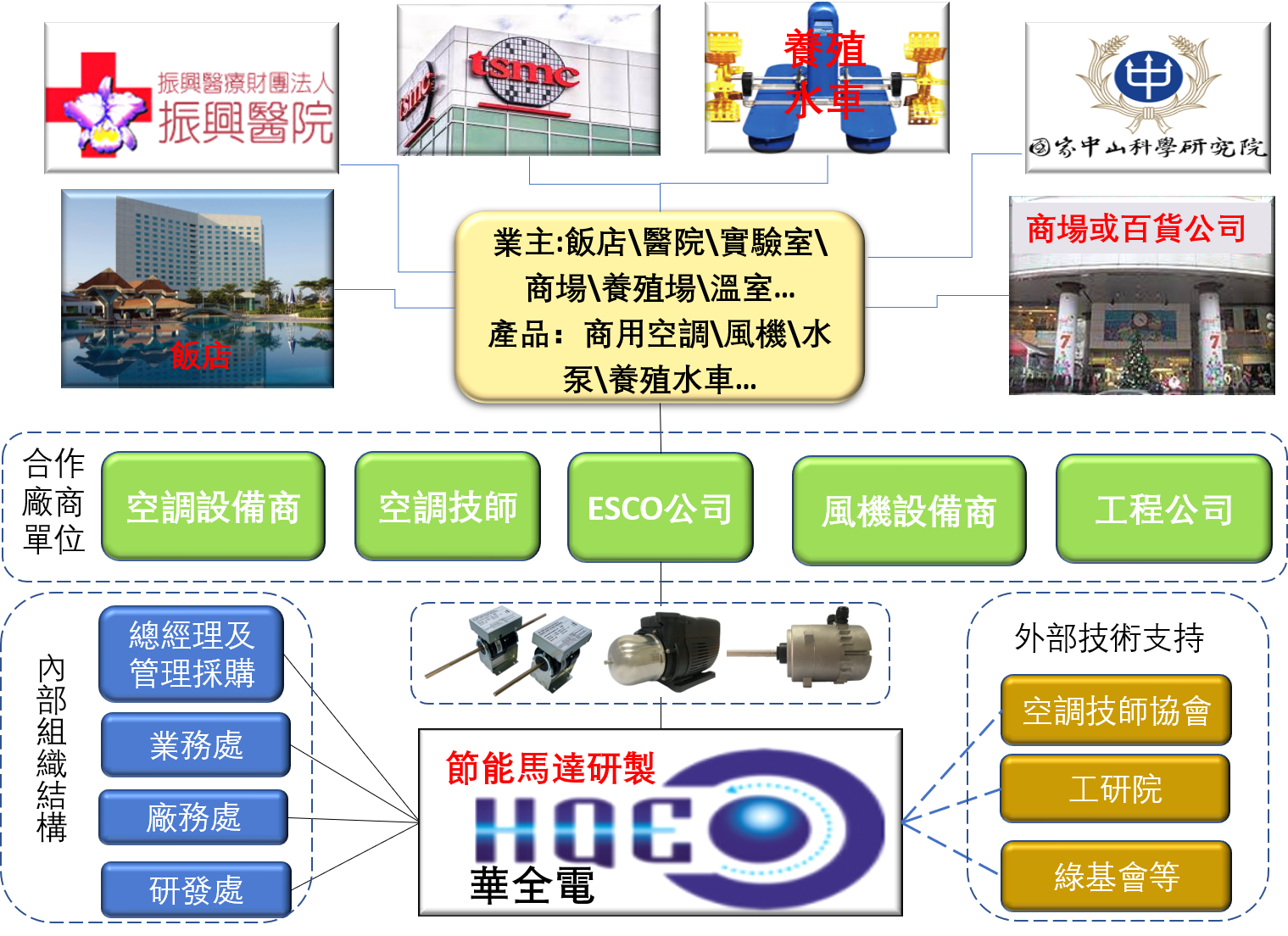 華全電專注馬達的研製,整合空調廠商,空調技師,ESCO公司(Energy Service Company)、風機廠商及各工程處等資源,為業主提供高效節能電機,真正實現經濟節能、低維護成本、AI智能聯合管理電機系統。業主包括酒店、醫院、實驗室、商場、養殖場、溫室等擁有長時間運轉電機設備的場所。內部組織包括業務、廠務、研發等部門,外部技術支持包括空調技師協會、工研院等科研單位,以保證公司具備最先進的科技和核心競爭力,長期處於行業領先地位。