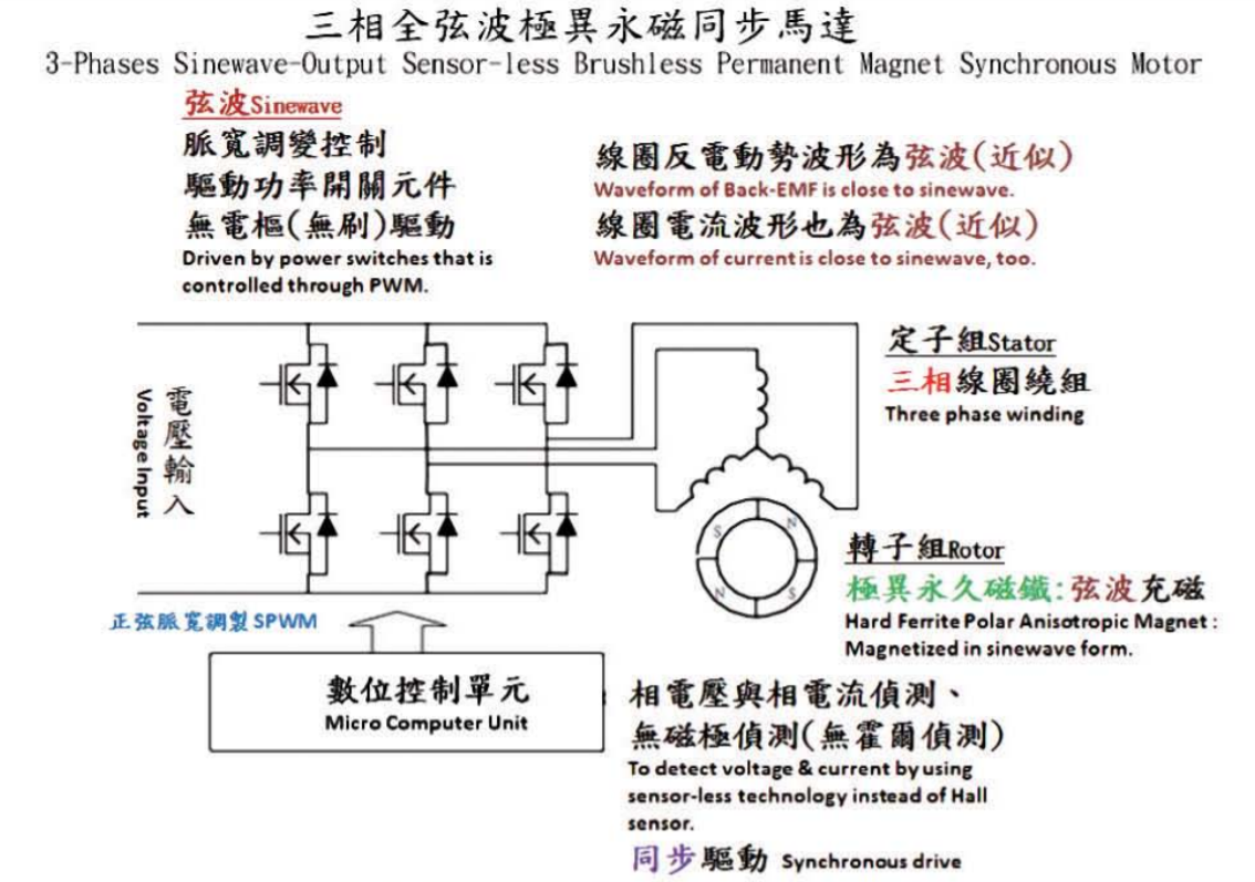 BLDC(Brushless)馬達的主要特色就是無需再使用電刷進行換相,而是利用電子技術控制。傳統有刷馬達的電刷一般為碳棒或碳製材料,長期磨損易造成馬達損壞,發熱也具有危險性,維護成本較高。而BLDC馬達在技術上突破使得直流馬達再一次被人們重視並發展,可以說BLDC是一個劃時代的電機發明和改良,而ECM馬達的基本構造是BLDC馬達,在此基礎上更是使用三相全弦波技術,通過合理設計MCU單片機組件,結合驅動板和控制模組將DC馬達技術再提高一個台階。