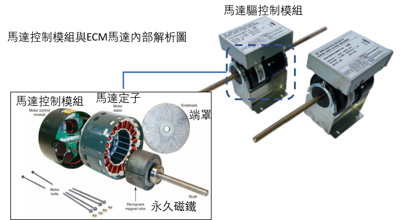 圖1. ECM基本組成剖析圖,左邊方格為內部解析圖,右邊為單雙軸ECM馬達成品圖,解析圖的左邊為控制模組,也可為方形,中間部分是三相定子,右邊部分是轉子和心軸,心軸也可以是雙軸,分佈兩端,中間部分為定子