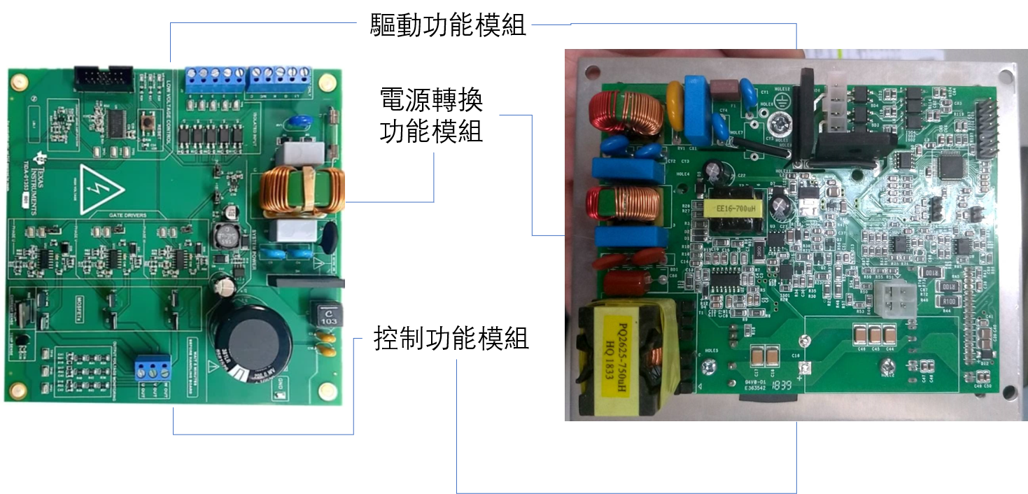 圖1. ECM馬達電路板設計基本構造,驅動功能模組、電源轉換功能模組、控制功能模組馬達